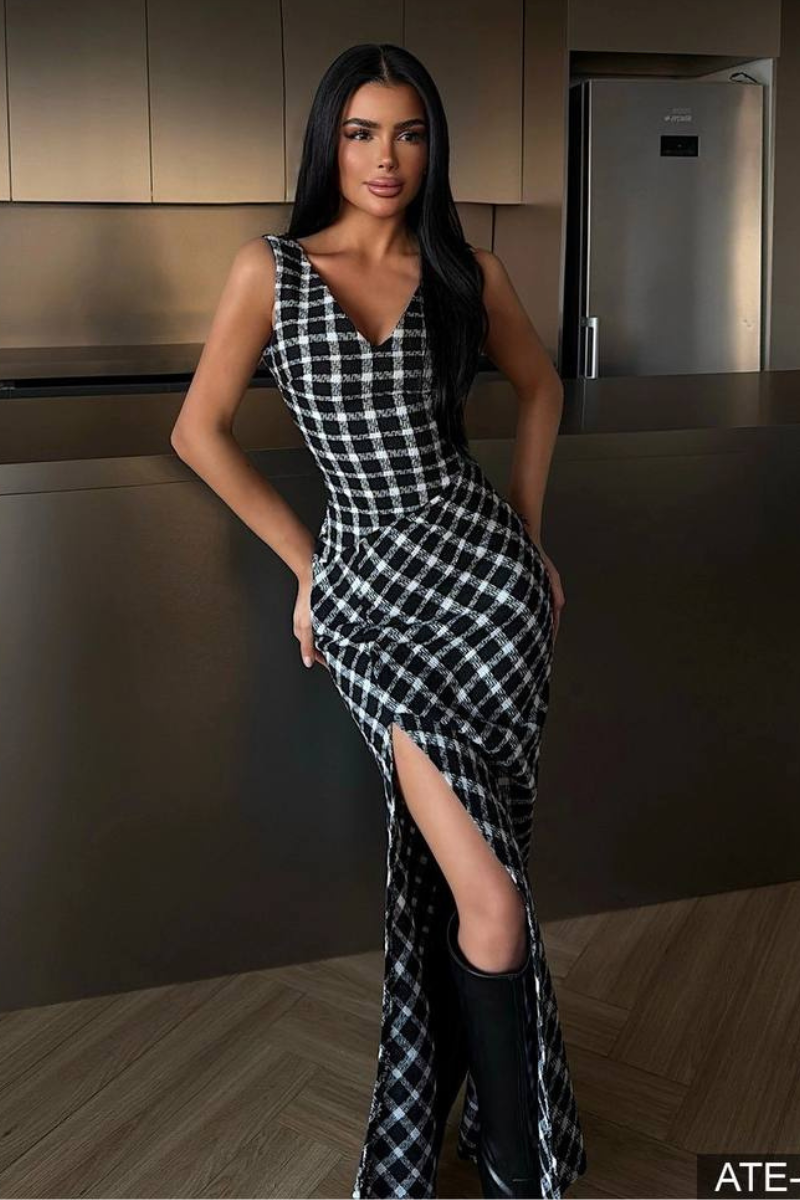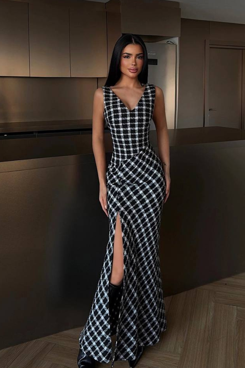 A timeless maxi dress featuring a classic plaid pattern and a flowing silhouette.
