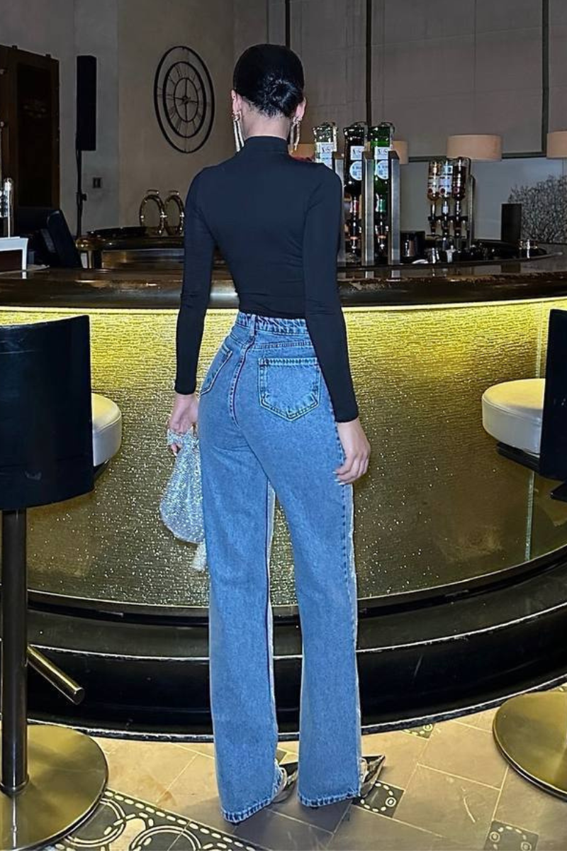 Stylish denim jeans embellished with shimmering details for a glamorous, standout look.