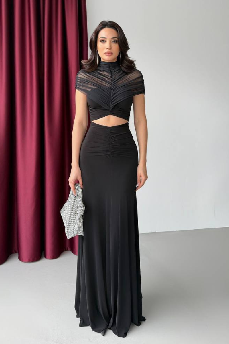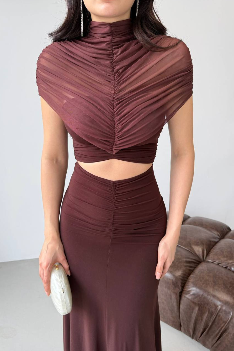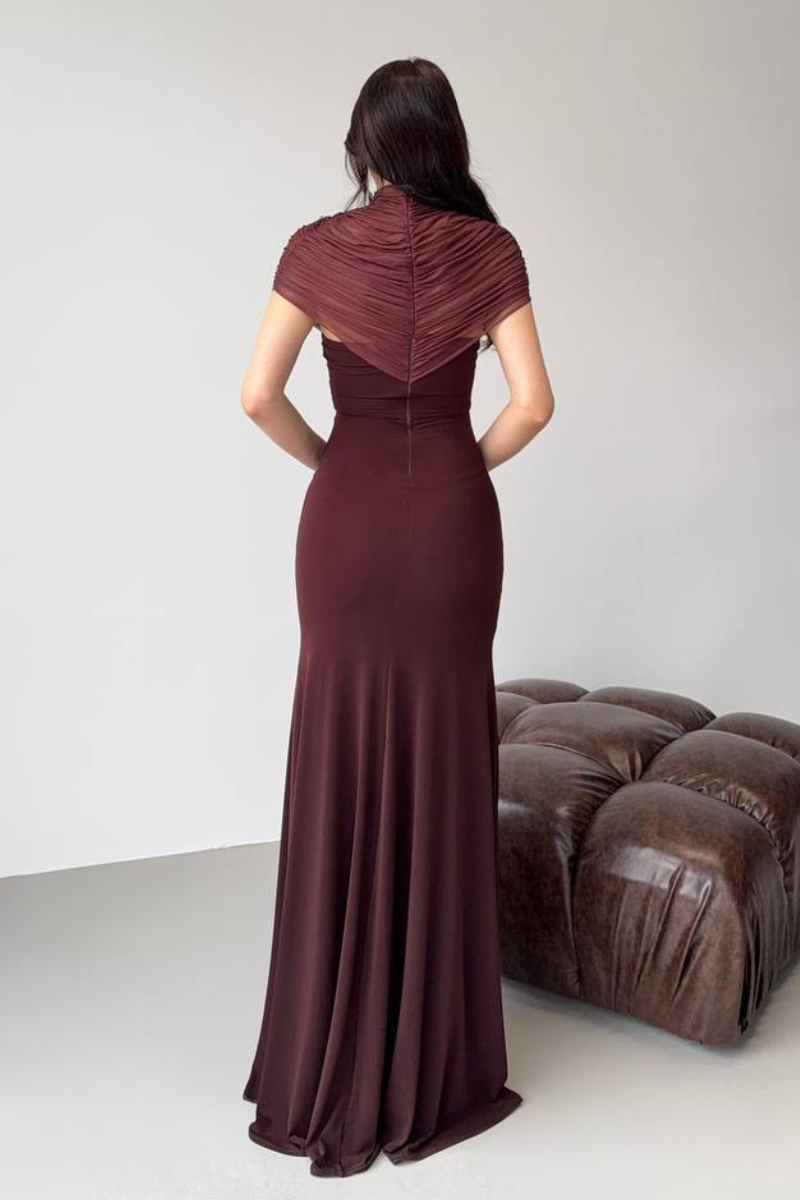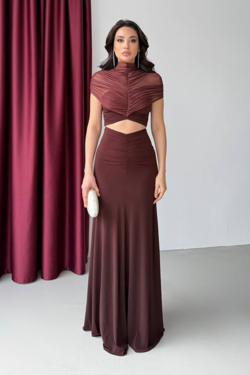 An elegant, floor-length sheer dress crafted from lightweight, flowy fabric that drapes beautifully over the body.