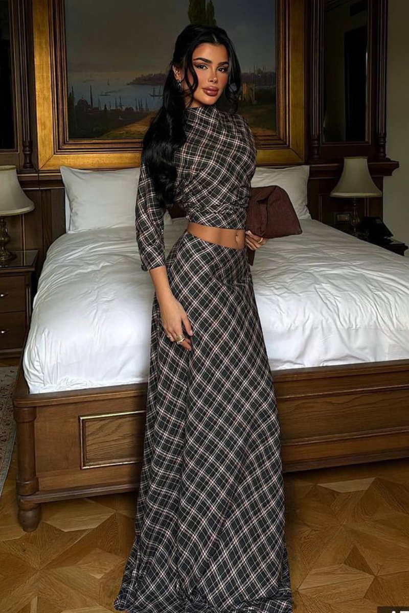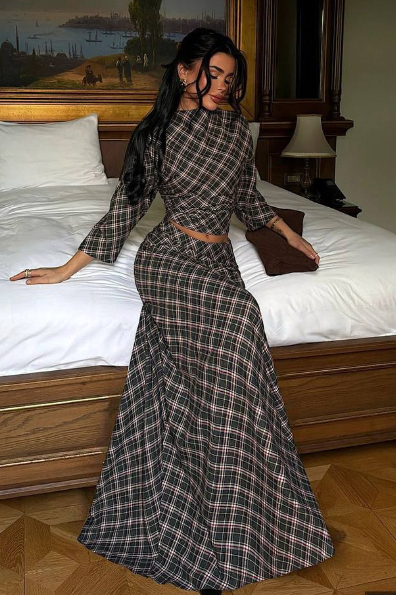 A stylish coordinated set featuring a flowing maxi skirt with a classic plaid pattern and a matching top.
