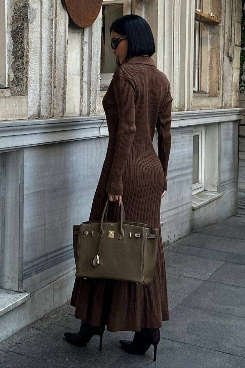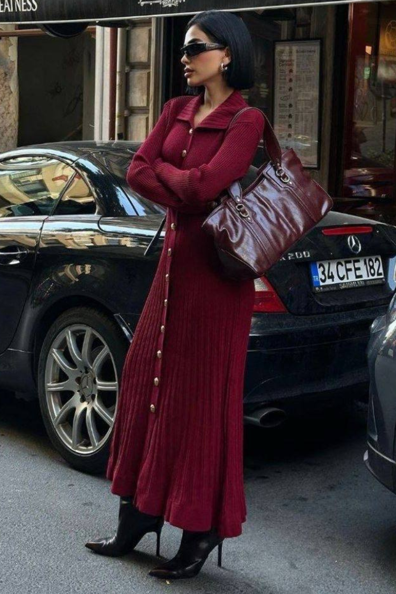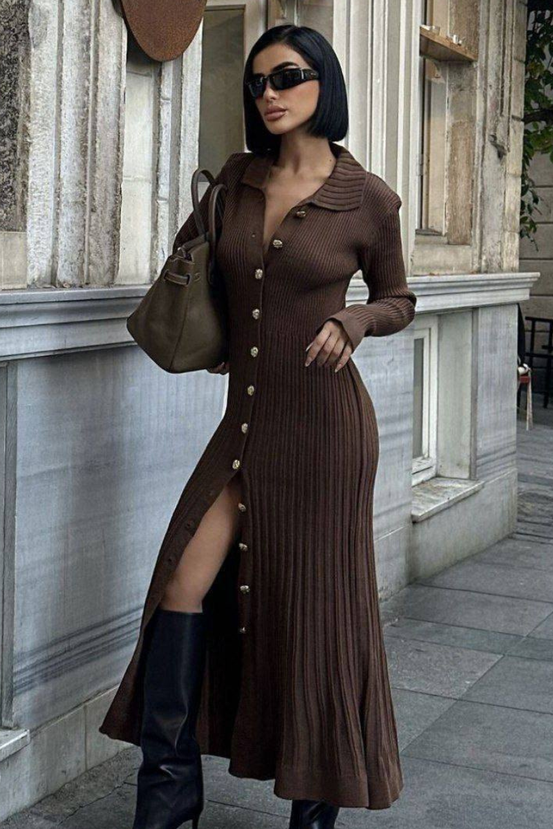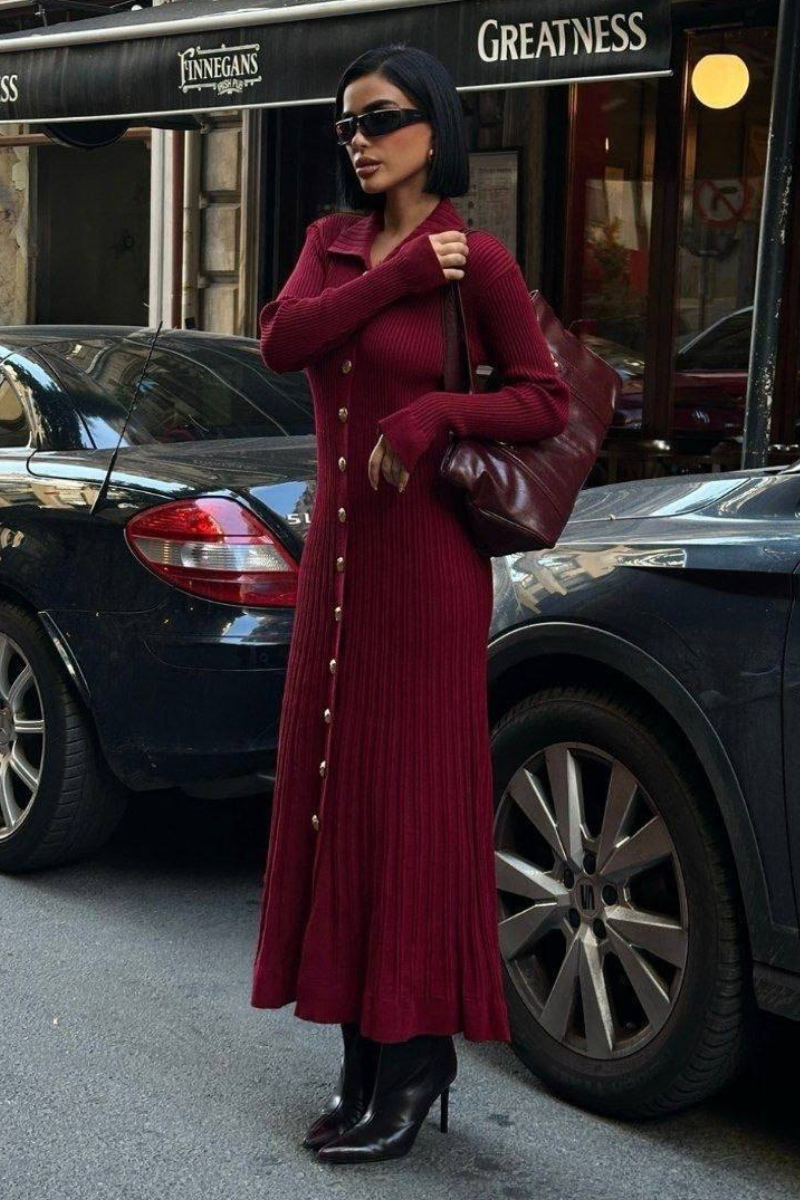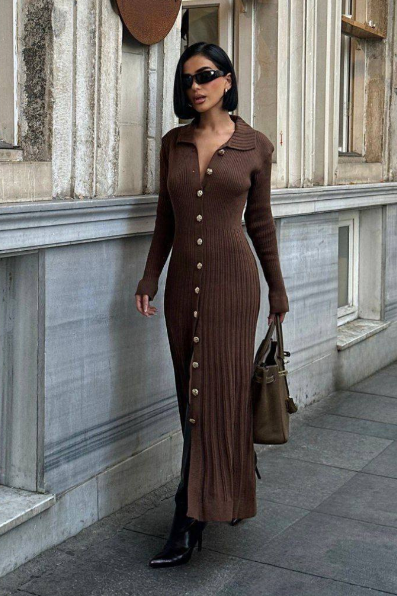 A cozy yet elegant maxi knit dress with a flattering silhouette, perfect for effortless all-day style.